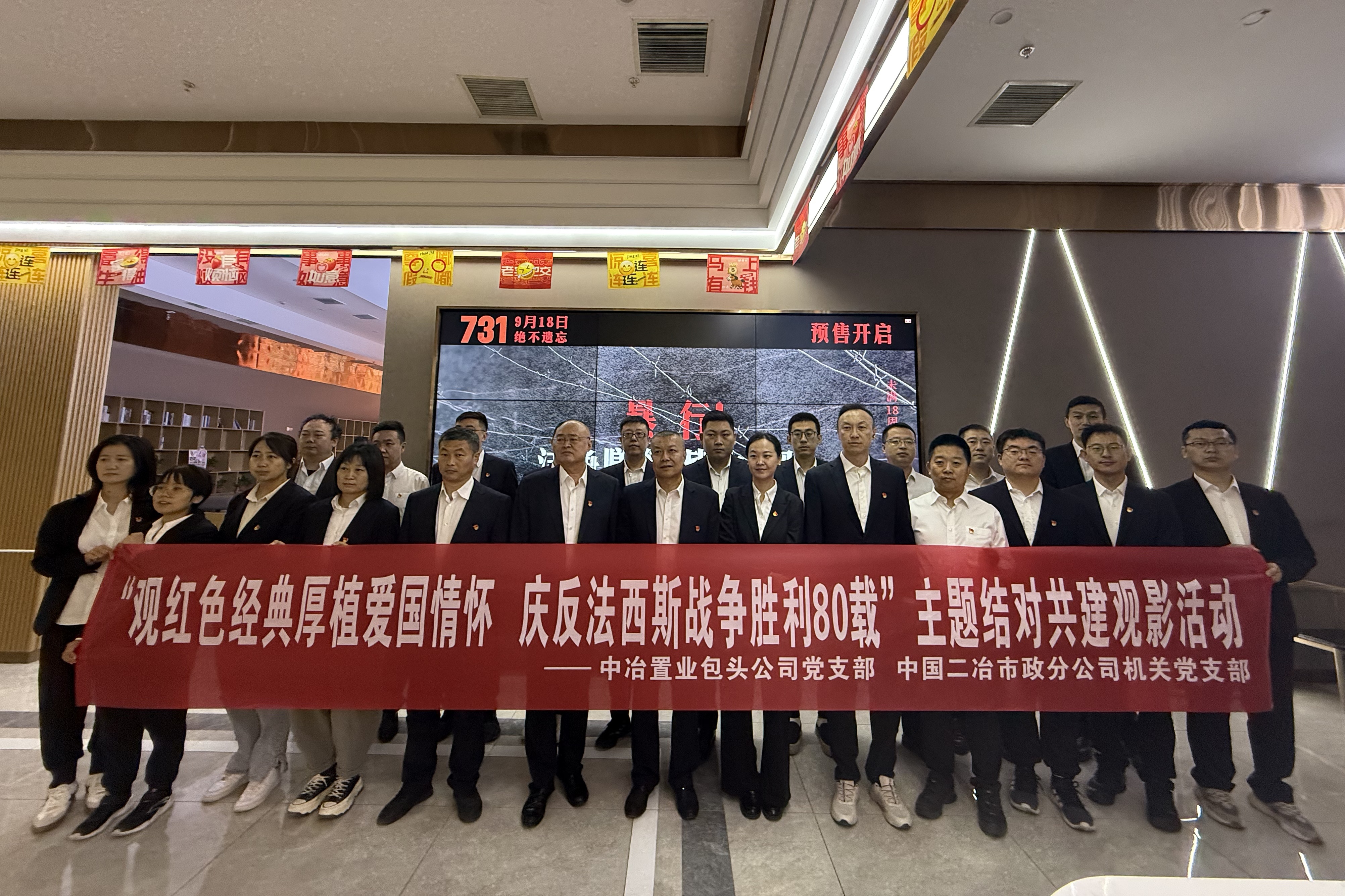 正值“九一八”事變歷史紀念節點,為紀念中國人民抗日戰爭暨世界反法西斯戰爭勝利80周年,深化職工愛國主義情懷,傳承和弘揚偉大民族精神,引導黨員從歷史中汲取力量,堅定理想信念,奮進新征程、建功新時代,9月18日,市政分公司機關黨支部與中冶置業集團包頭公司黨支部以“觀紅色經典厚植情懷,慶反法西斯勝利80載”為主題,組織60余名黨員、入黨積極分子集中觀看歷史題材電影《731》,開展沉浸式愛國主義教育活動。