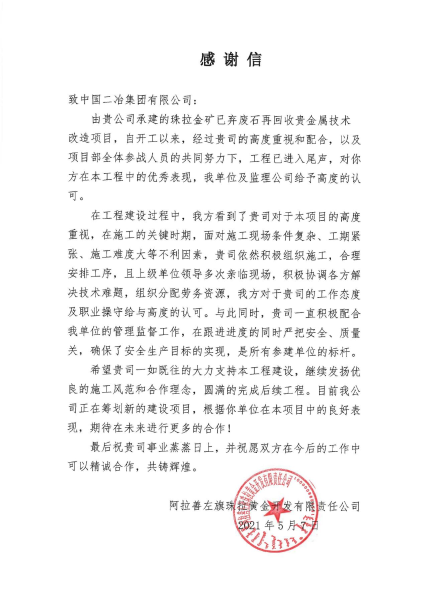 阿拉善左旗珠拉黃金開發(fā)有限責(zé)任公司在感謝信中指出,在工期緊、任務(wù)重的情況下,項(xiàng)目部在跟進(jìn)進(jìn)度的同時(shí),嚴(yán)把安全質(zhì)量關(guān),確保了安全生產(chǎn)目標(biāo)的實(shí)現(xiàn),是所有參建單位中的標(biāo)桿。