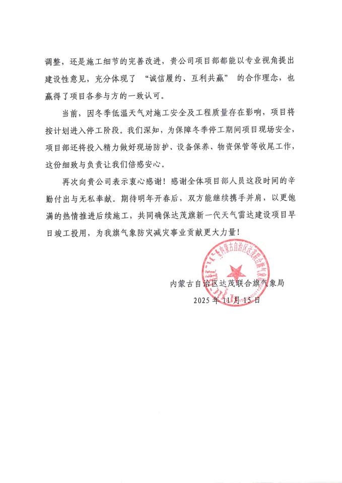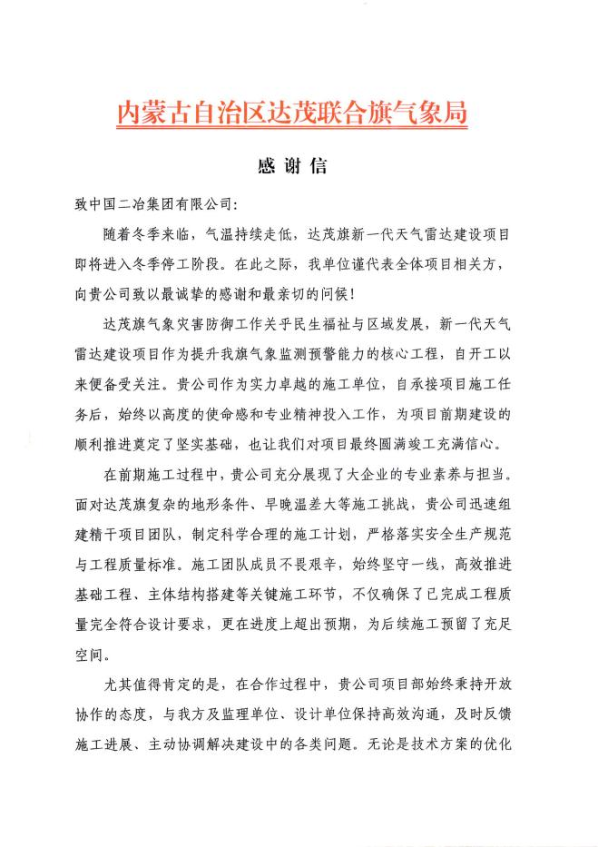 11 月 16 日,中國二冶收到內(nèi)蒙古自治區(qū)達茂聯(lián)合旗氣象局發(fā)來的感謝信,信中對公司在達茂旗新一代天氣雷達建設(shè)項目施工中的專業(yè)表現(xiàn)與辛勤付出給予高度肯定,并致以誠摯感謝。